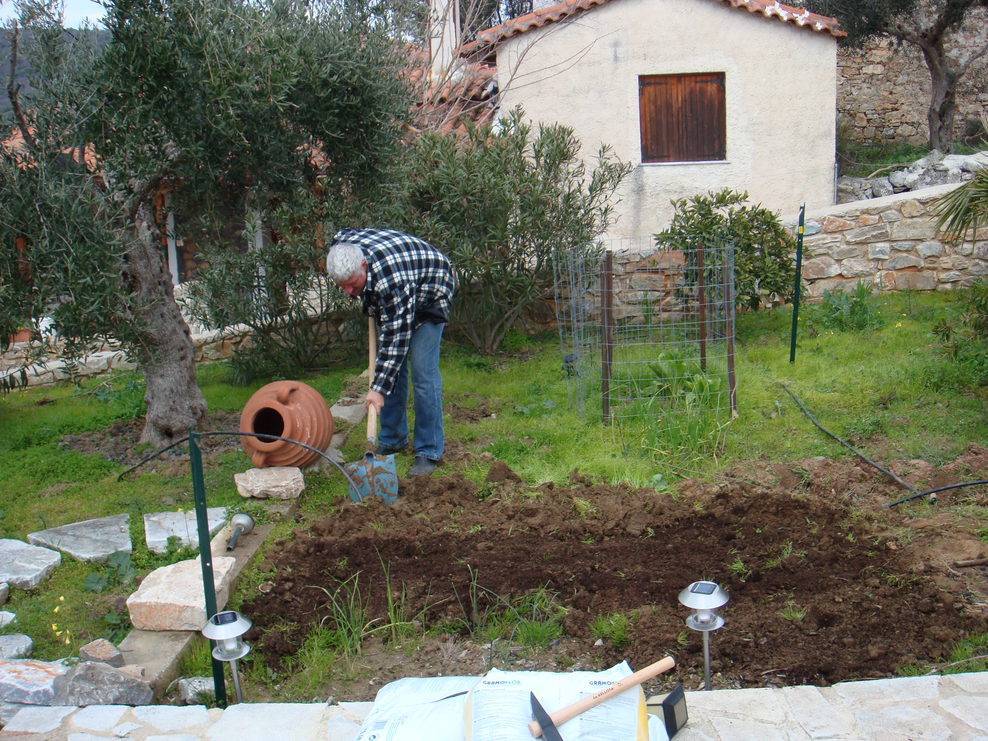 Jeroen is begonnen met de moestuin. Er staat nu een hek omheen om het geen kattenbak te laten worden.
