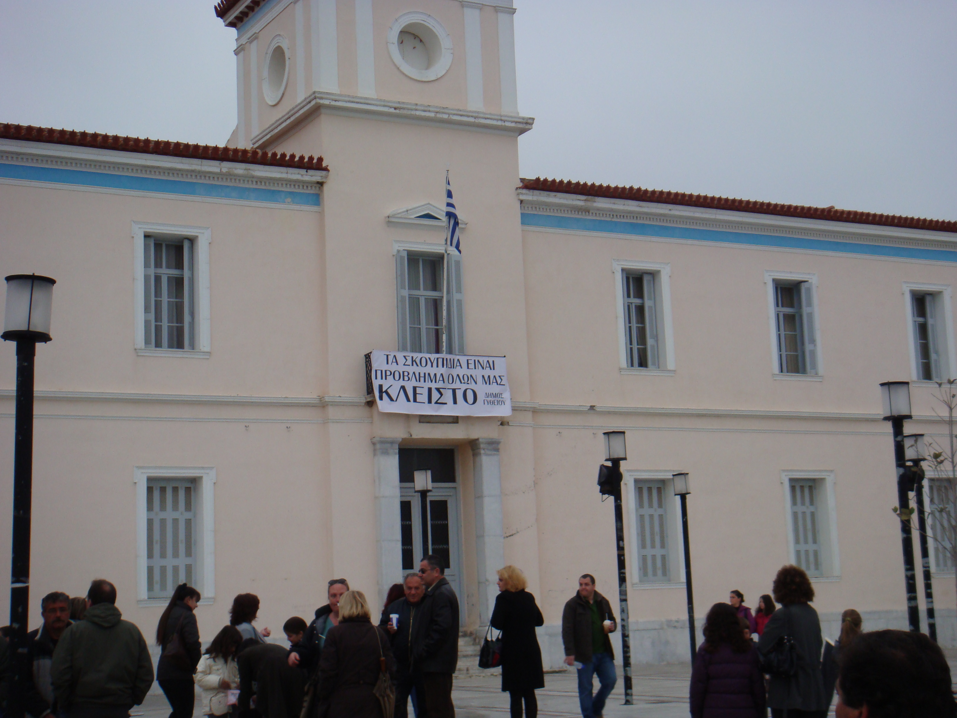 De mensen in Gythion en omstreken worden nu echt wakker. Vanochtend om 8.00 uur was er een grote demonstratie bij het stadhuis over het afval, dat niet wordt opgehaald.