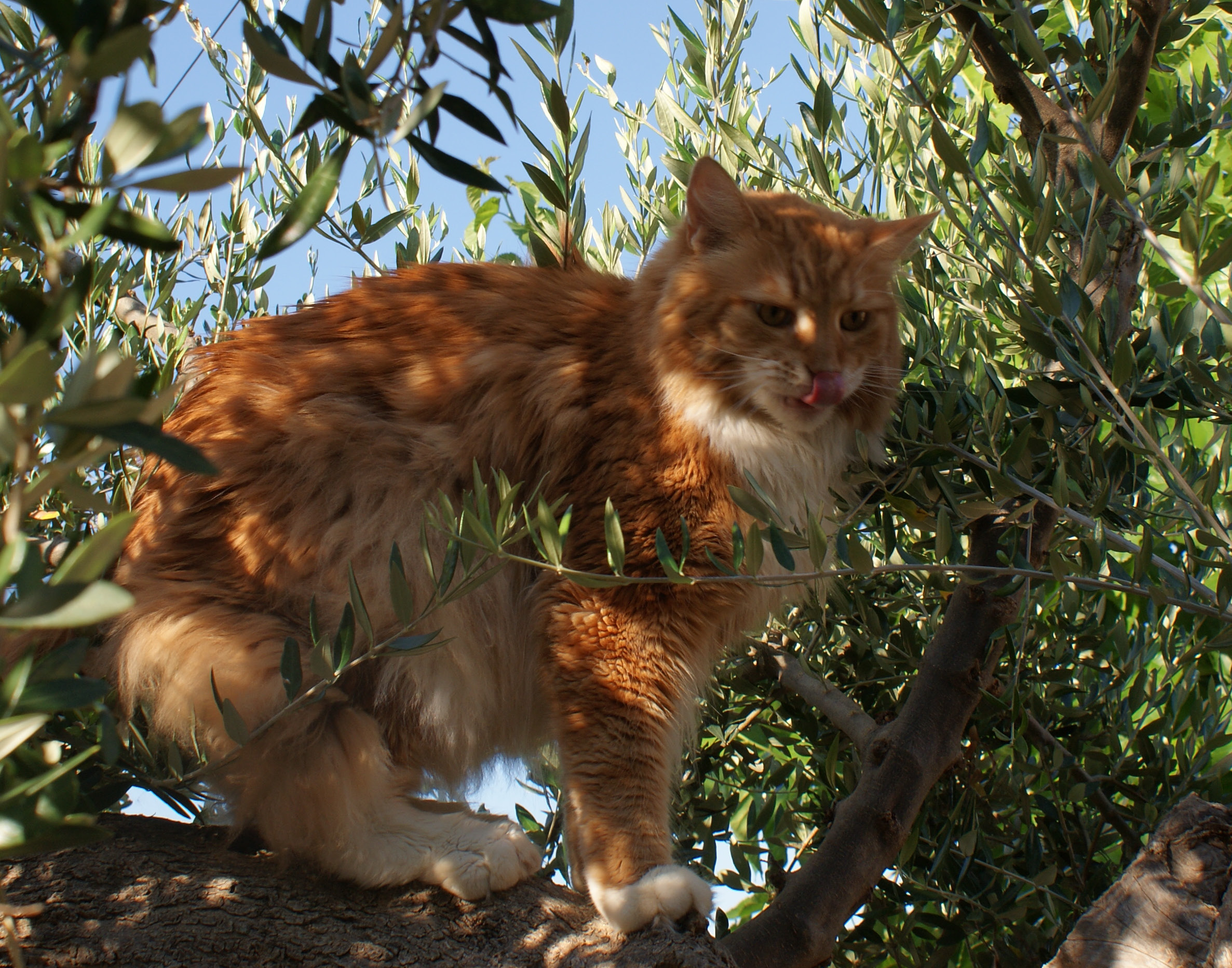 Hercules vindt de olijfboom, net als voorheen in Nederland, helemaal geweldig. We moeten hem nog wel in de boom zetten, maar dan is hij helemaal gelukkig.