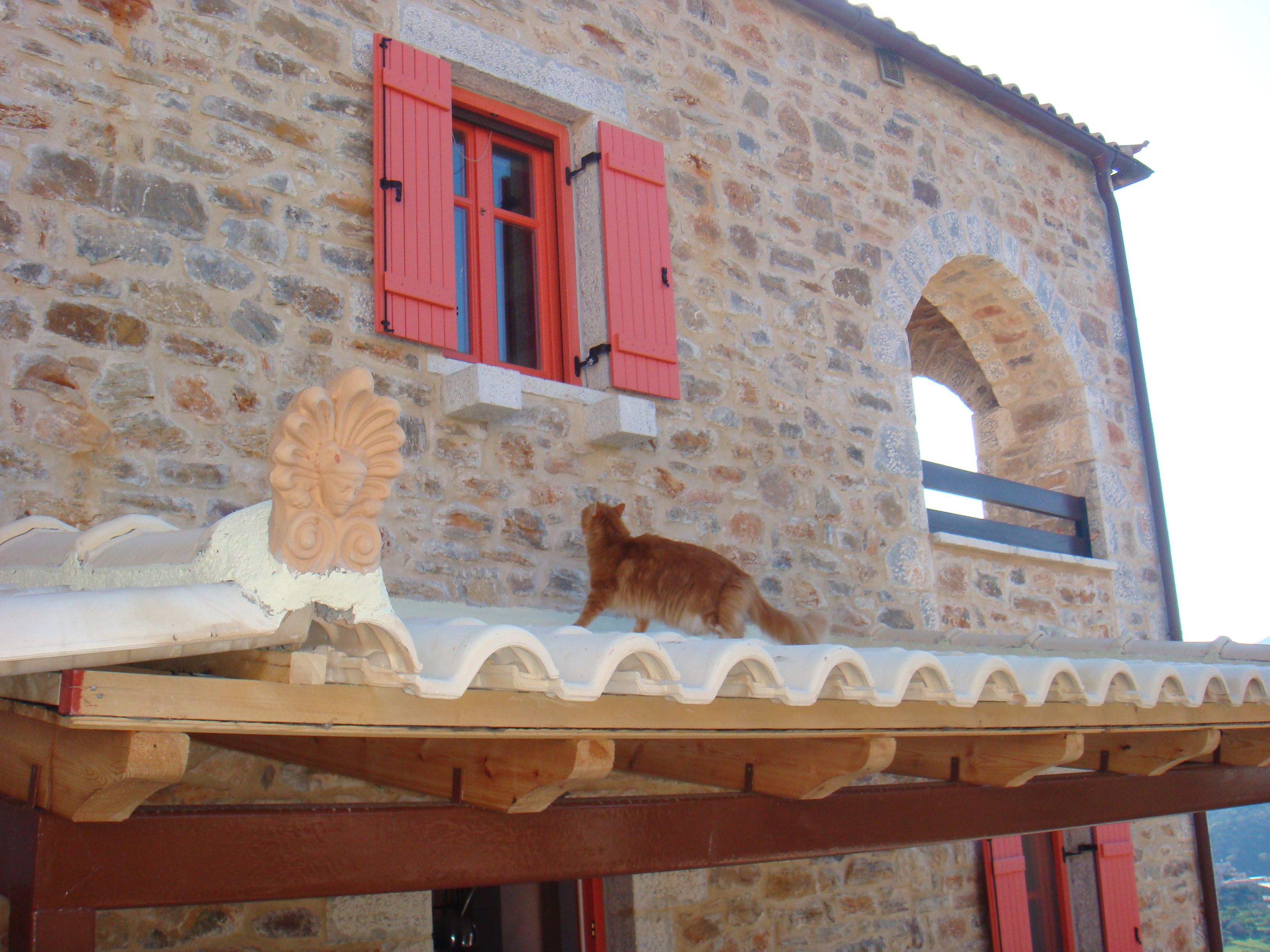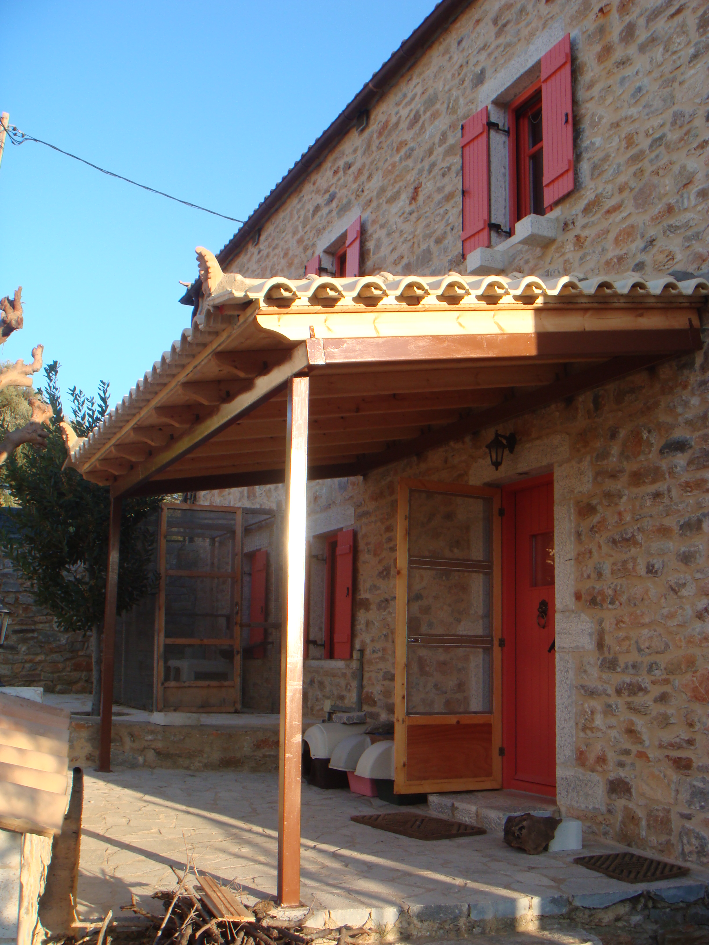 Zowel bij de voordeur (een achterdeur hebben we niet eens) als bij de parkeerplek voor de auto hebben we nu een overkapping die de harde wind, die af en toe kan opsteken, moet kunnen doorstaan. In de zomer hebben we iets meer schaduw en met regen worden we niet meteen nat als we naar buiten gaan.