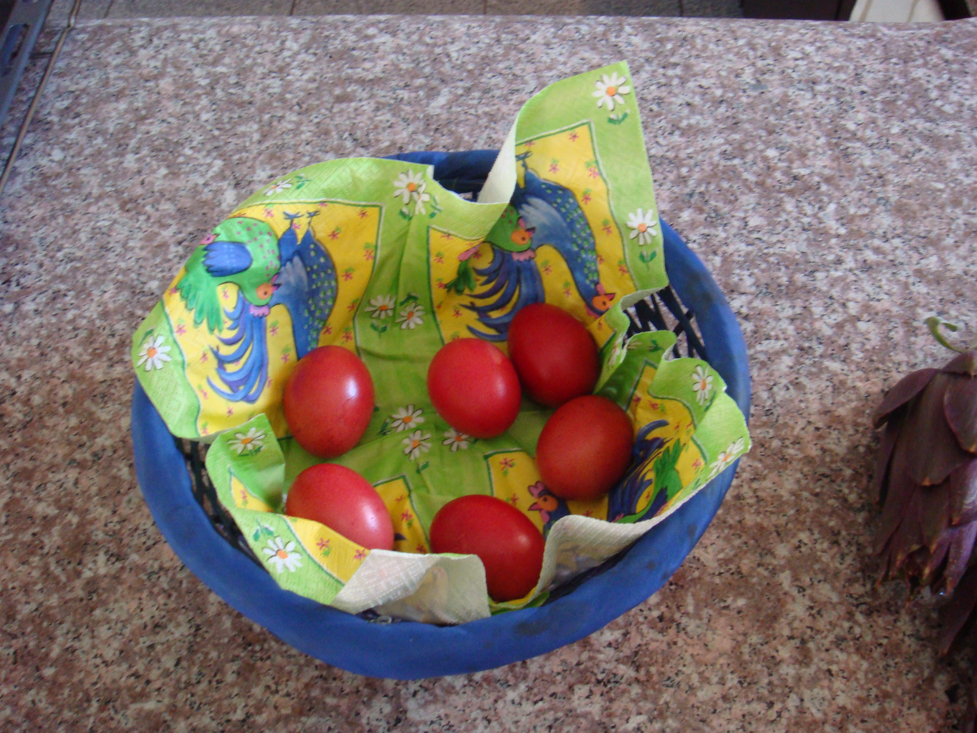 Pasen was relatief rustig, omdat we dit jaar geen geit/lam op het spit hadden. Doordat het zo vroeg viel, hebben we niemand uitgenodigd. Uiteindelijk hebben we bij Kyria Martina gegeten. Zij heeft gekookt, want we hebben tegen haar gezegd dat wij niets doen. Wel hebben we paaskoekjes gebakken en eieren geverfd, dat is nu eenmaal traditie.