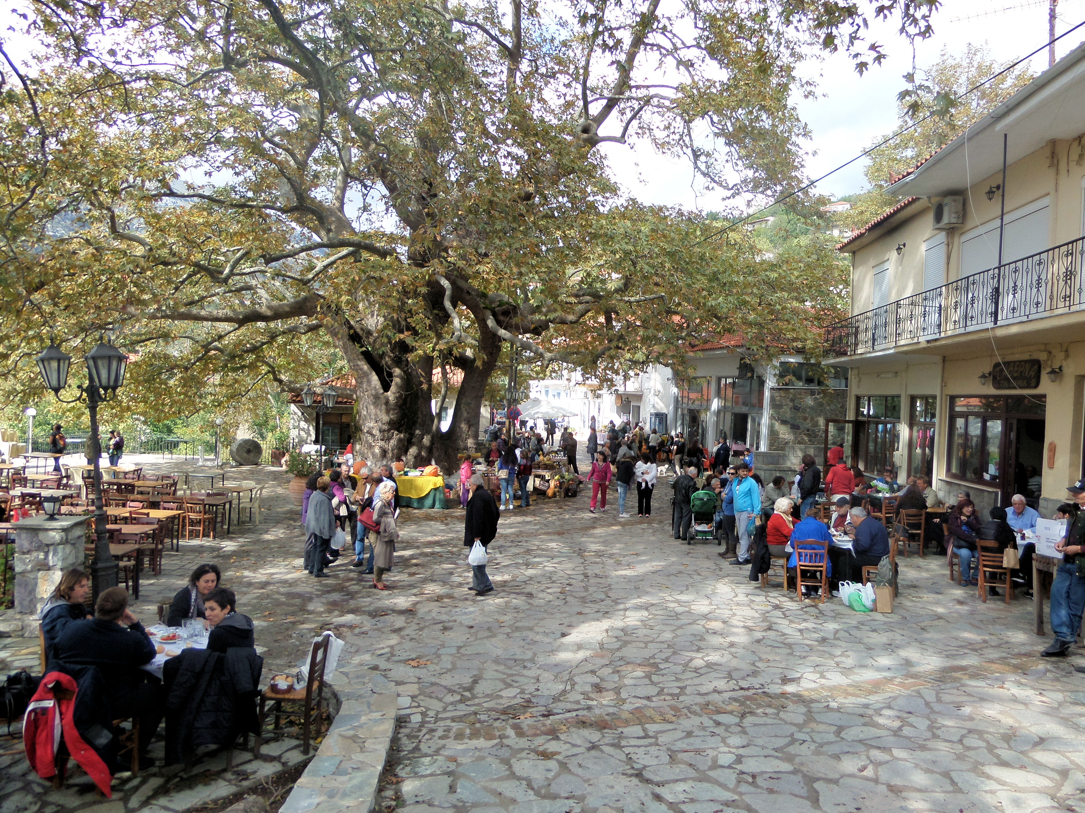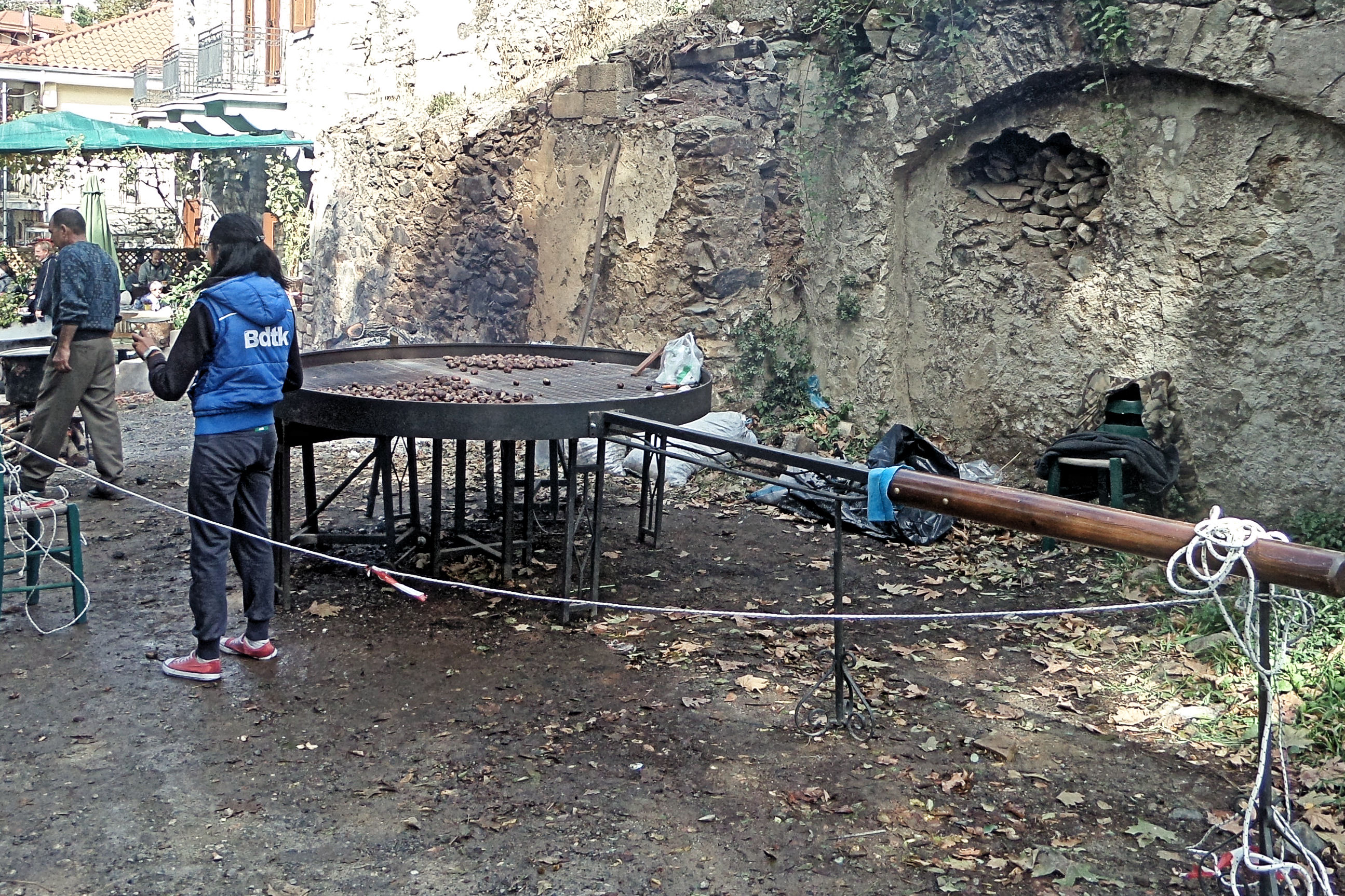 Het laatste weekend van oktober vieren ze in Arna, een bergdorpje in de buurt, het zogenoemde kastanjefeest (nu voor de 11e keer). Bij de ingang van het dorp staat een grote roosterpan voor de gepofte kastanjes (gratis) en krijgt iedere gast een welkomstdrankje in de vorm van eigen gestookte tispouro (de lokale jenever). Er zijn stalletjes met kastanjes, walnoten, wijn, tsipouro, appels , vijgen met oregano etc. Tevens houdt een aantal kunstenaars een soort van expositie. Een leuk feestje en goed georganiseerd.
