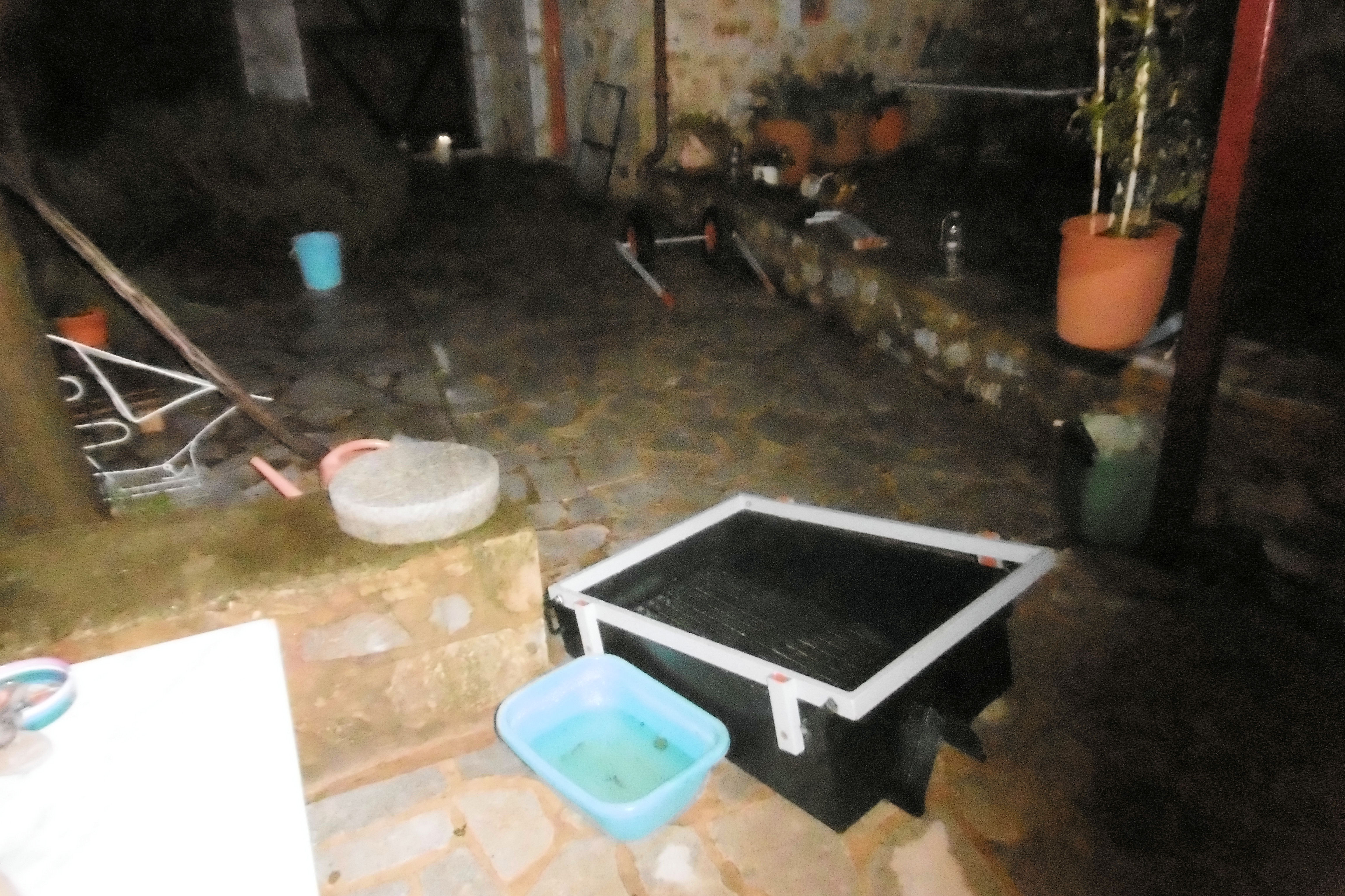 Afgelopen donderdagnacht is er een windhoos/wervelwind, in het grieks ανεμοστρόβιλος, door Marathea heen getrokken. In onze tuin zijn een aantal zwaardere dingen door de hoos een paar meter verplaatst. Onder meer een deel van de “schudbak”, waarmee we de olijven van de blaadjes en takjes scheiden, lag ’s ochtends ergens anders.