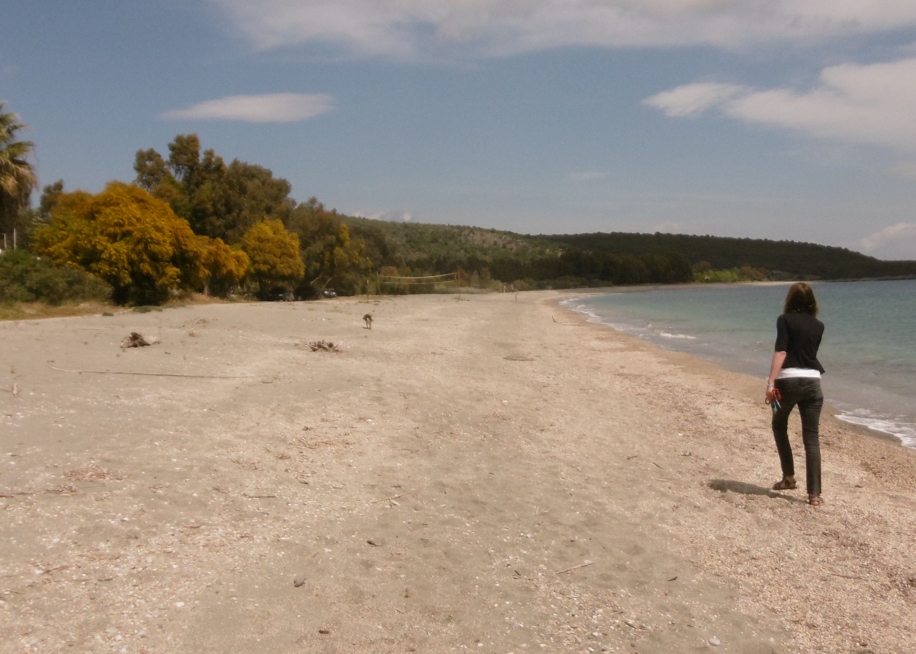 Inmiddels is Blue Beach, bar/taverna op het strand van Vathi, weer open (veel eerder dan andere jaren) en konden we onszelf dus trakteren op een drankje na de zwem. Het zeewater is nog aan de frisse kant, met name op het moment dat je erin gaat. Anderhalve week geleden waren we al wezen kijken, toen met Souri die voor het eerst los mocht op het strand.