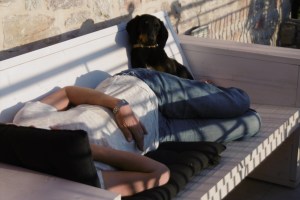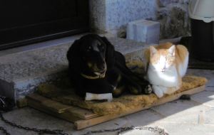 Pasen zelf hebben we rustig gevierd. “s Ochtends hebben we de reguliere “weekenddames” van het asiel ontlast door de honden te verzorgen. Daarna zijn we naar Vasilis (Thalami in Ageranos) gegaan om daar met een deel van de familie te Paasmaaltijd te nuttigen. Door het mooie weer kringelden in de hele omgeving rookpluimen van de vuurtjes waarop de geitjes en lammetjes werden geroosterd. Daarna nog heerlijk op ons eigen terras gezeten/gelegen, totdat de zon achter de bergen verdween.