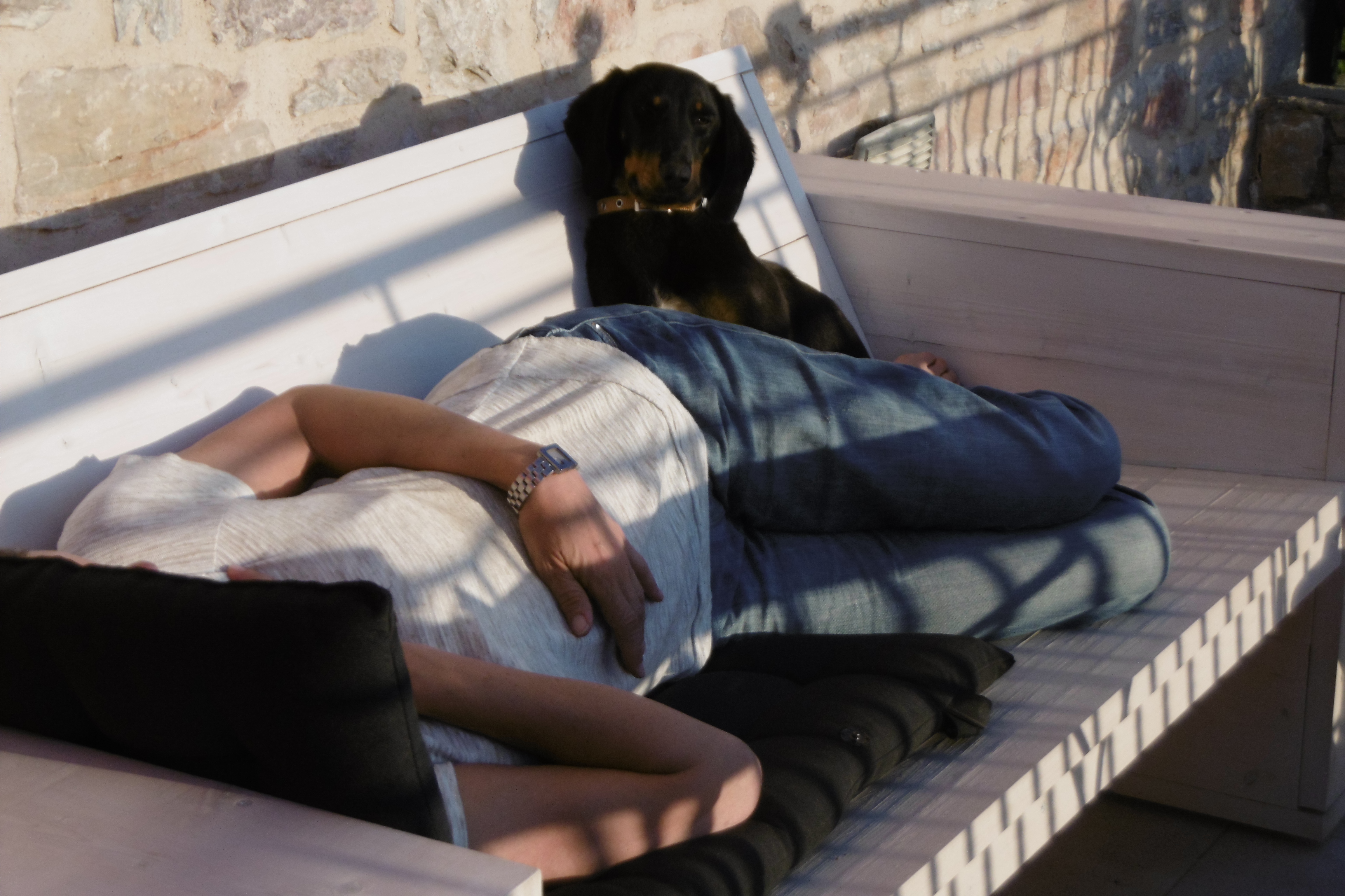 Om de nieuwe buitenbank nog lekkerder te laten zitten, hebben we een aantal kussen (via Internet) besteld.