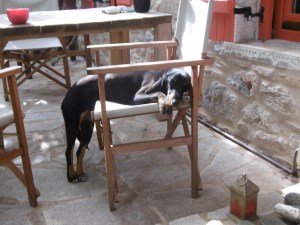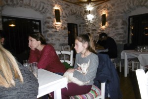 Toen we een keertje in Karvelas bij Petrino waren eten met onze Belgisch buren (hebben een huis vlakbij de waterpomp van Marathea), zaten aan een andere tafel mensen te eten die hun geit hadden meegenomen.