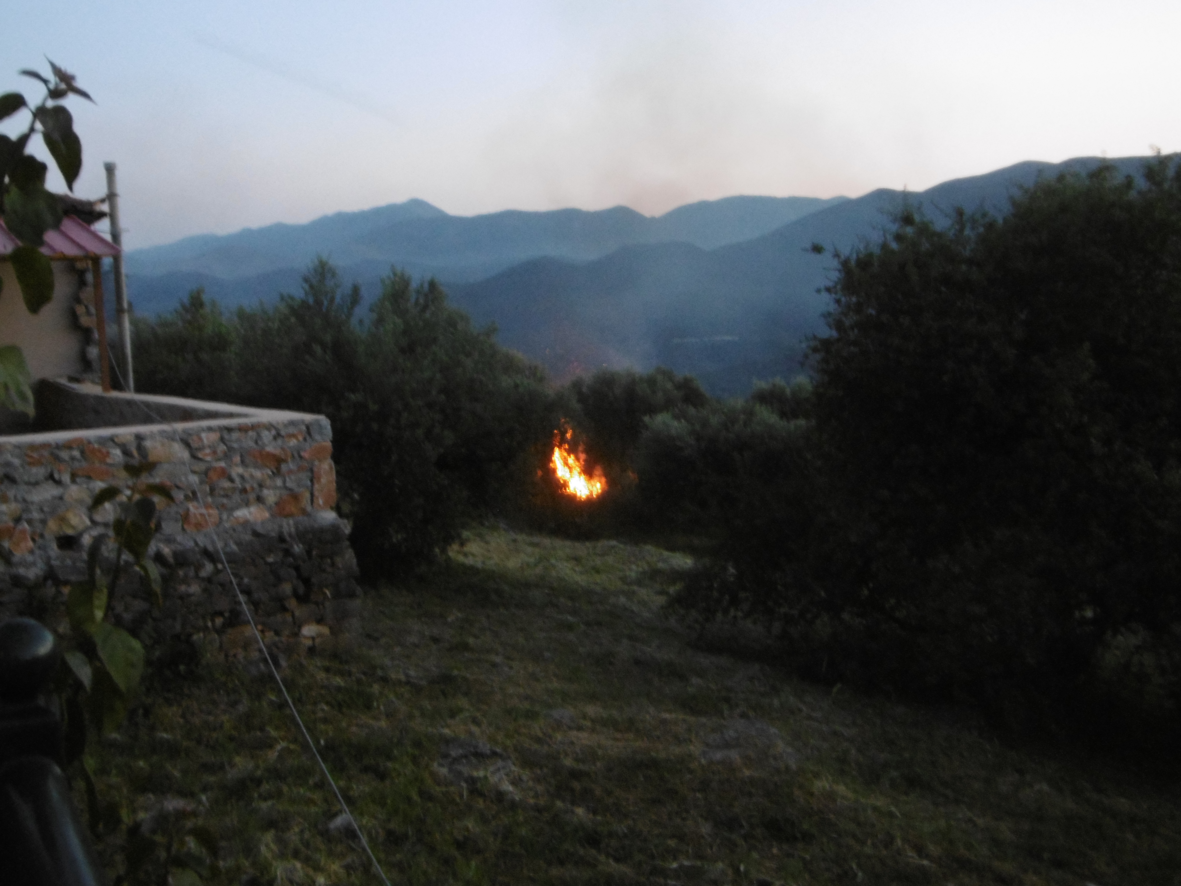 Eind april was de brandweer in Marathea. Apostolis, onze buurman, was ’s avonds takken aan het verbranden en daarbij waren de vlammen hoog.