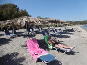 De parasols en ligbedden staan er weer en ook de bar/taverna Blue Beach is weer geopend. En onze favoriete groente-/fruitboer, Sarantos, is weer open. Hij zit vlakbij de afslag naar Vathi/Ageranos en heeft verreweg het beste fruit en groente van de hele streek.