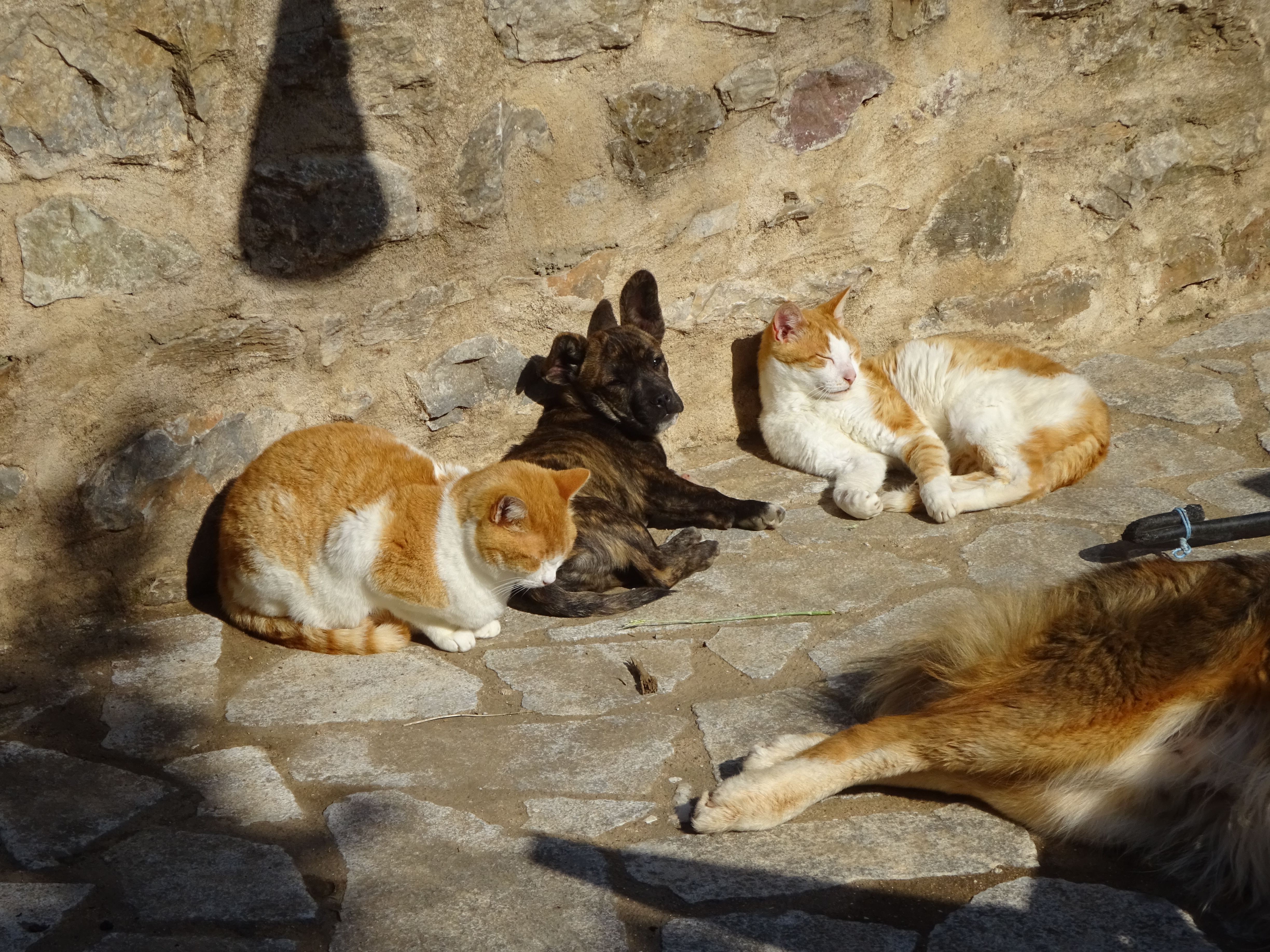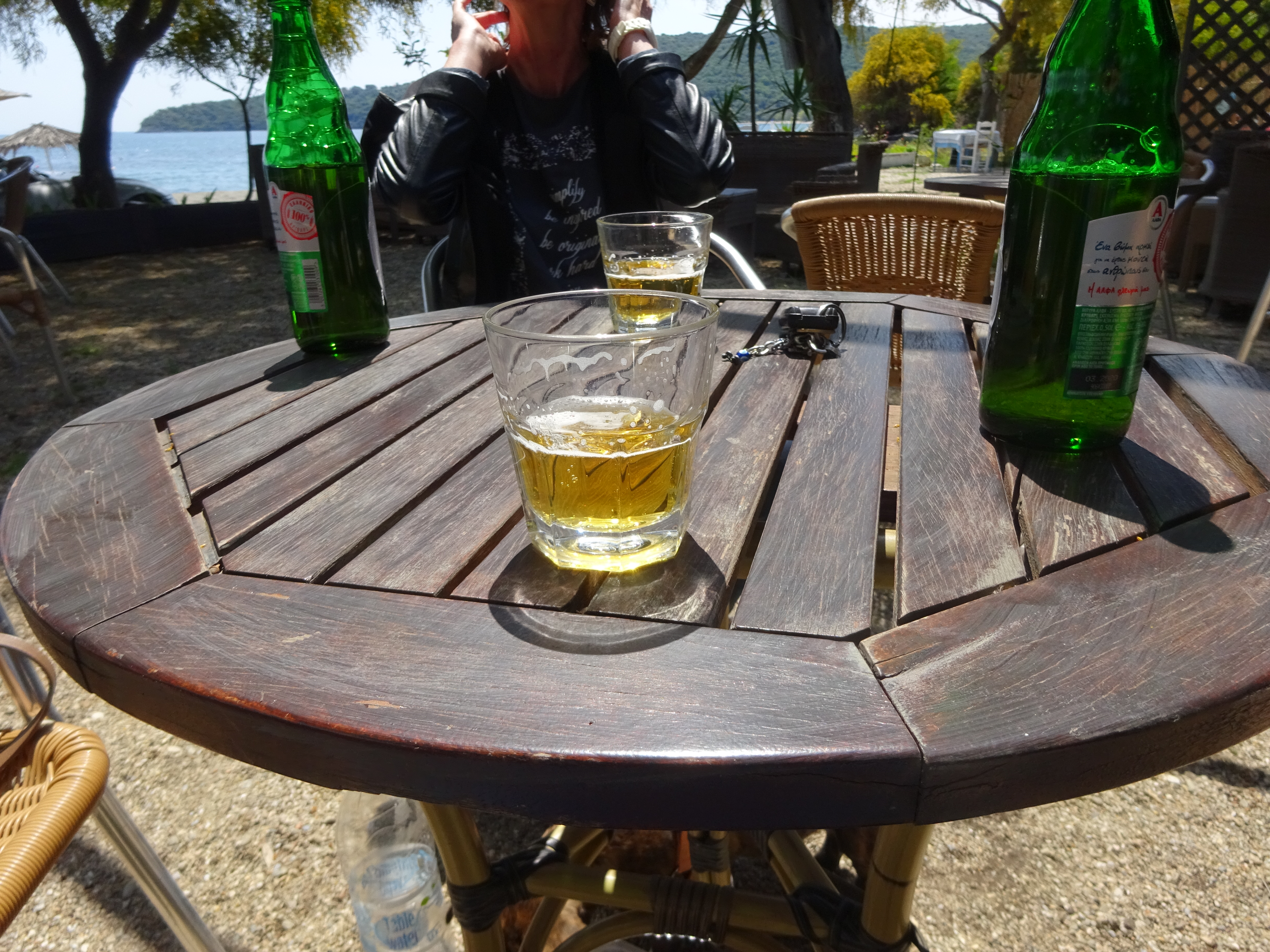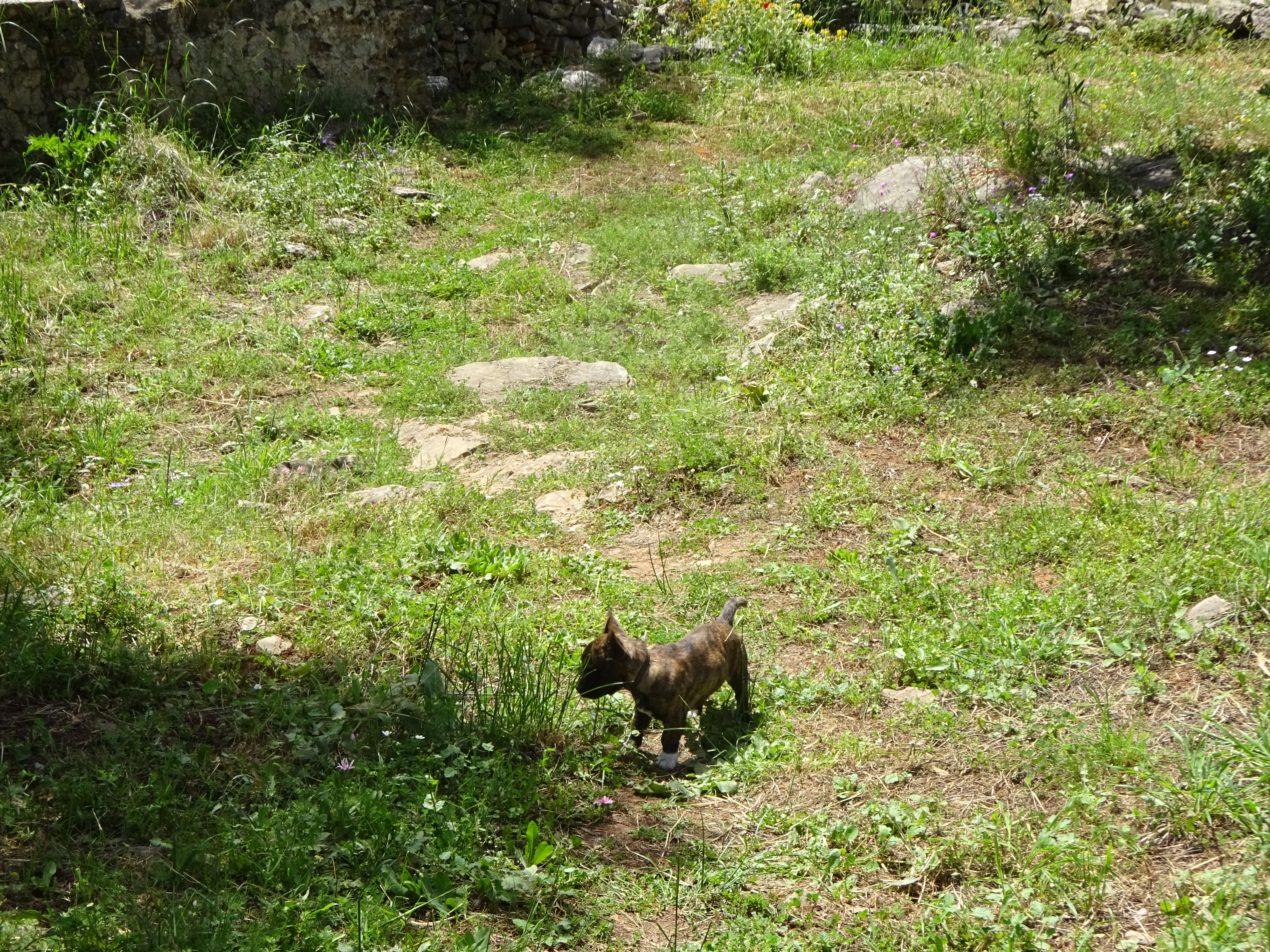 Met de nieuwe aanwinst, Morgan, gaat het goed. Hij loopt inmiddels ’s ochtends en ’s avonds mee met Dysie en Anonymos en wanneer we het Varkenspad aflopen, mag hij zelfs vrij. Op 21 april zijn we met Morgan naar Vathi gegaan, Blue Beach is open en de eerste parasols zijn geplaatst. Laat maar komen, die zomer! Overigens is de nieuwe weg bij Passava alweer dicht, omdat de wegwerkzaamheden op de oude weg zijn beëindigd. Wanneer deze nieuwe weg echt open gaat …..?