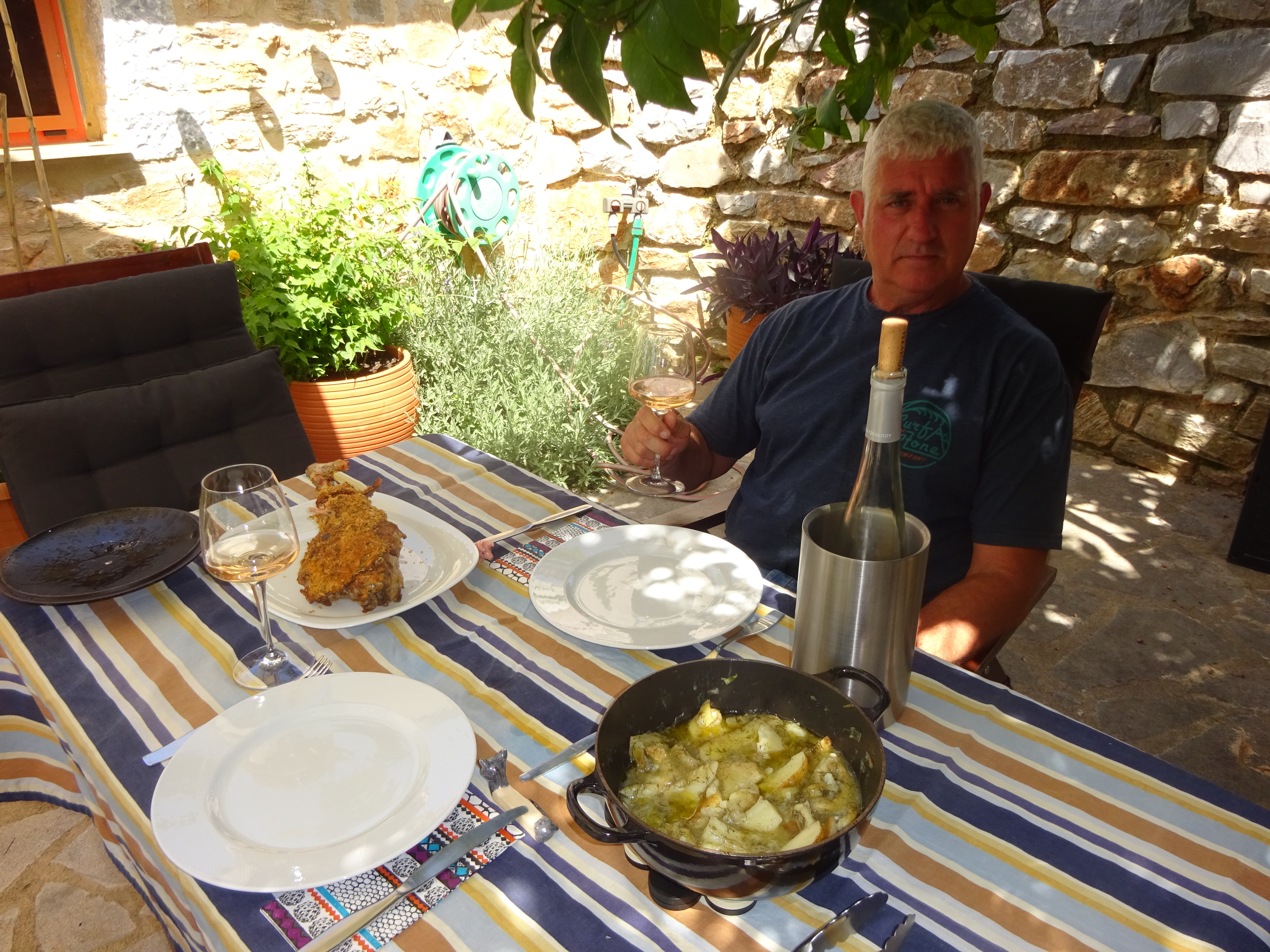 Er was geen tijd voor een groot gezelschap met een lam op het spit, omdat we de Paas ochtend zijn gestart bij het asiel. En een lam/geit op het spit kost in totaal meer dan 4 uur, dus dat ging niet wat betreft de tijdsplanning. Inmiddels (vanaf Goede Vrijdag) is het prachtig weer, dus lekker buiten eten.