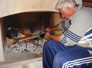 Na de 7 dagen olijvenpluk in “was het alweer tijd voor de Kerst. Eerst zijn we nog bezig geweest met het snoeihout te selecteren op bruikbaar aanmaakhout voor de open haard. Dat de open haard nu dagelijks brandt, heeft onder andere als voordeel dat we ook kunnen grillen. Op de foto wordt een door Noulis gevangen vis (Loutsos, een soort van barracuda achtige vis) gegrild.
