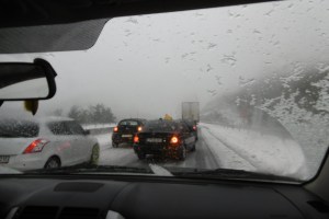 Door de verwarring van de treintijden (dienstregeling is anders dan de werkelijkheid) hebben we Henk van het vliegveld opgehaald. Normaal is het een “ritje” van iets minder dan 3 uren, deze keer (22 december 2017) duurde de rit 4,5 uur door hevige sneeuwval onderweg. Over een afstand van 60 kilometer op de snelweg rond Tripoli viel behoorlijk veel sneeuw.