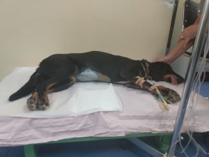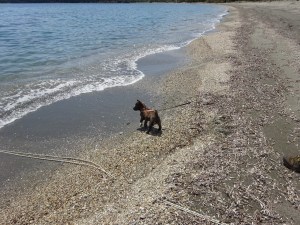 En ze moet een kap dragen zodat ze niet in haar oog gaat wrijven. Dergelijke dingen kunnen niet op het asiel, dus moest ze elders, lees bij ons, tijdelijk verblijven. Ze doet het prima met de andere honden en katten. Xanthi is inmiddels gesteriliseerd. Weer een zorg minder. Op les gaat het steeds een beetje beter, ze kan inmiddels lopen aan een langere lijn. Om te trainen nemen we haar tegenwoordig ook af en toe mee naar plaatsen waar mensen zijn, zoals bijvoorbeeld Blue Beach