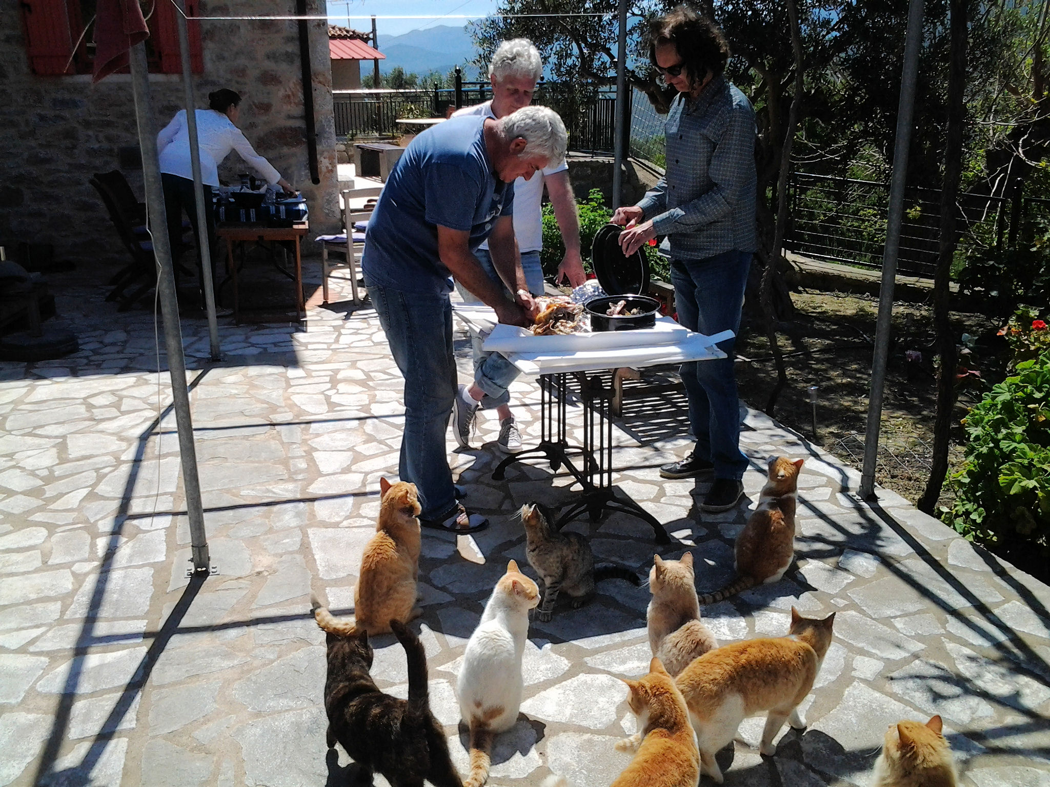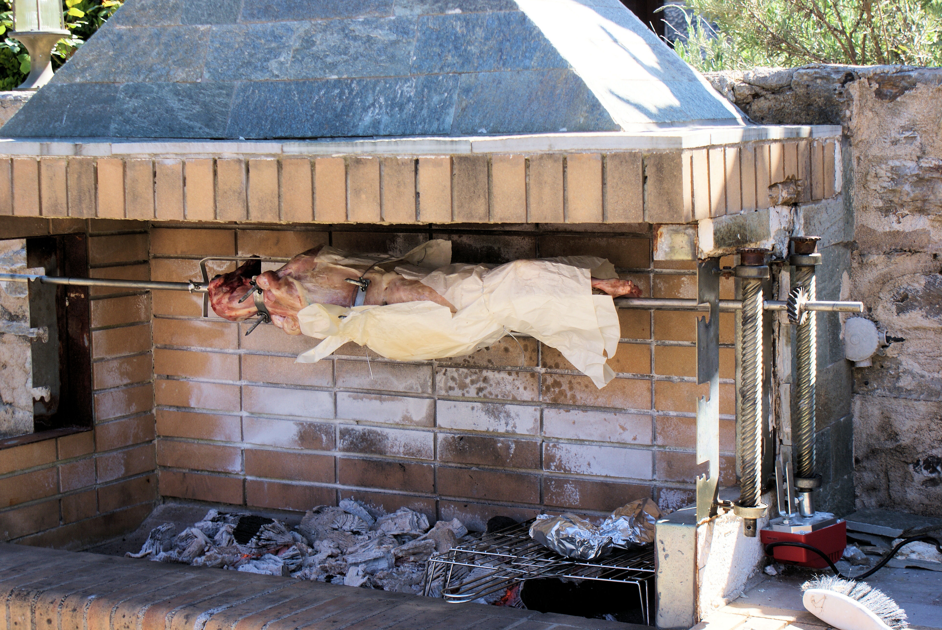 De zondag voor het Griekse Pasen, 12 april, (er zat dit jaar een week tussen het Nederlandse en het Griekse Pasen) was het bij ons nog koud en bewolkt. En de woensdag voor Pasen was er zelfs nog storm. Maar zaterdag werd het opeens mooi weer en met Pasen was het zonnig en bijna windstil. Het ideale weer voor een geitje op het spit en zo geschiedde. We hadden dit jaar een klein geitje van slechts 4,4, kilo. Het gezelschap was namelijk lekker klein, de buren, Maarten en wijzelf.