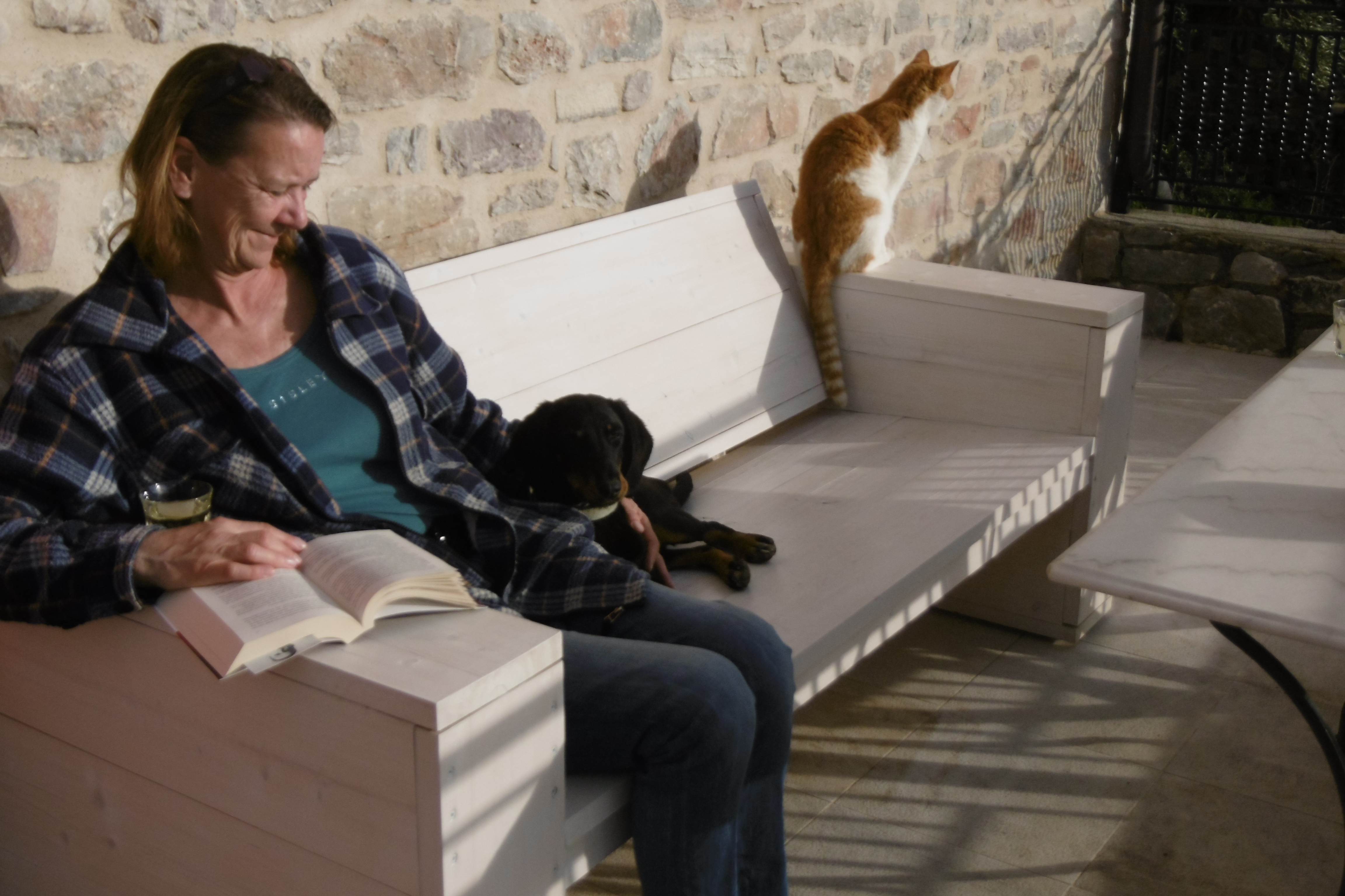 De buitenbank is inmiddels geschilderd en wordt bij goed weer ’s middags gebruikt.