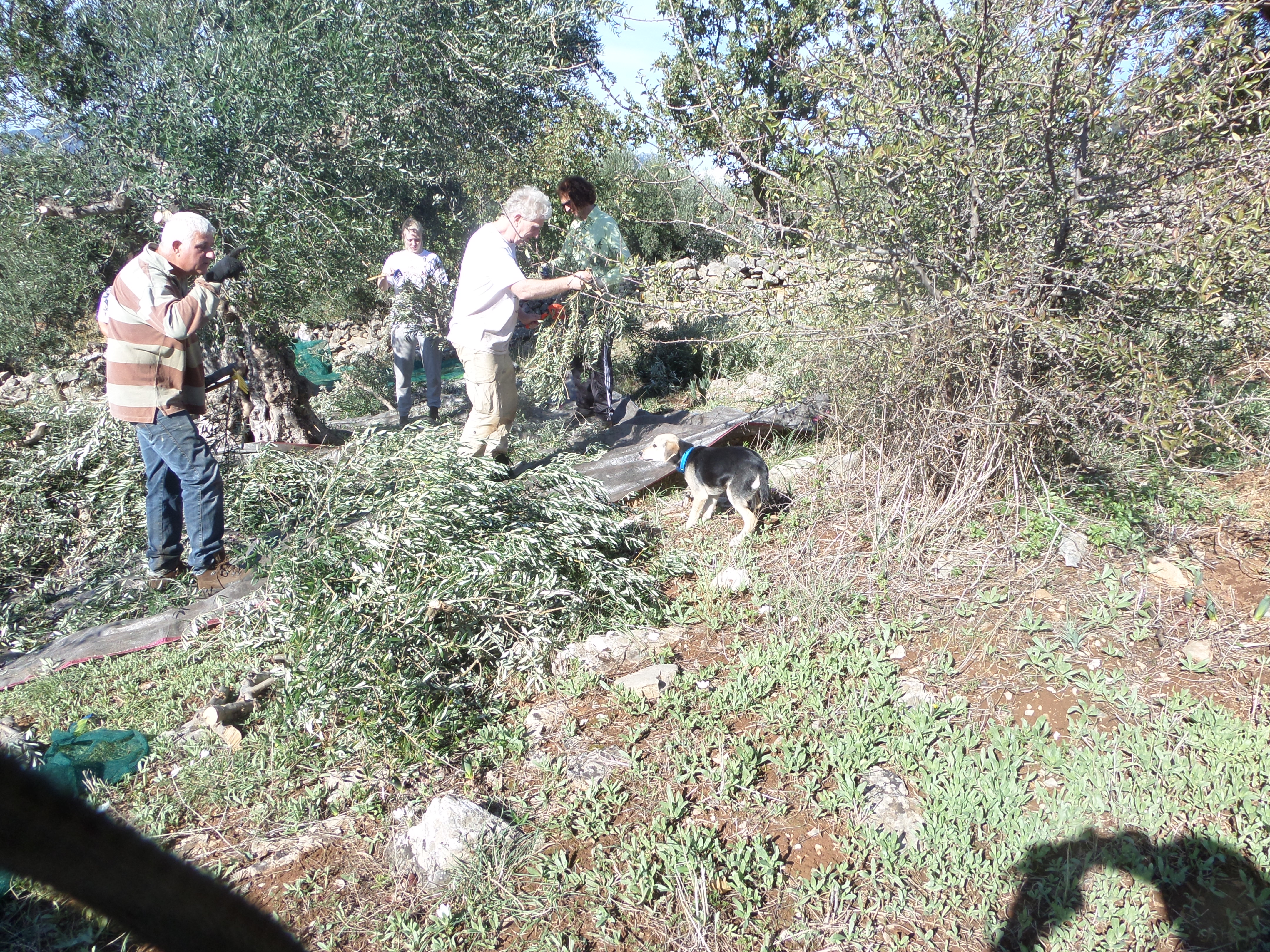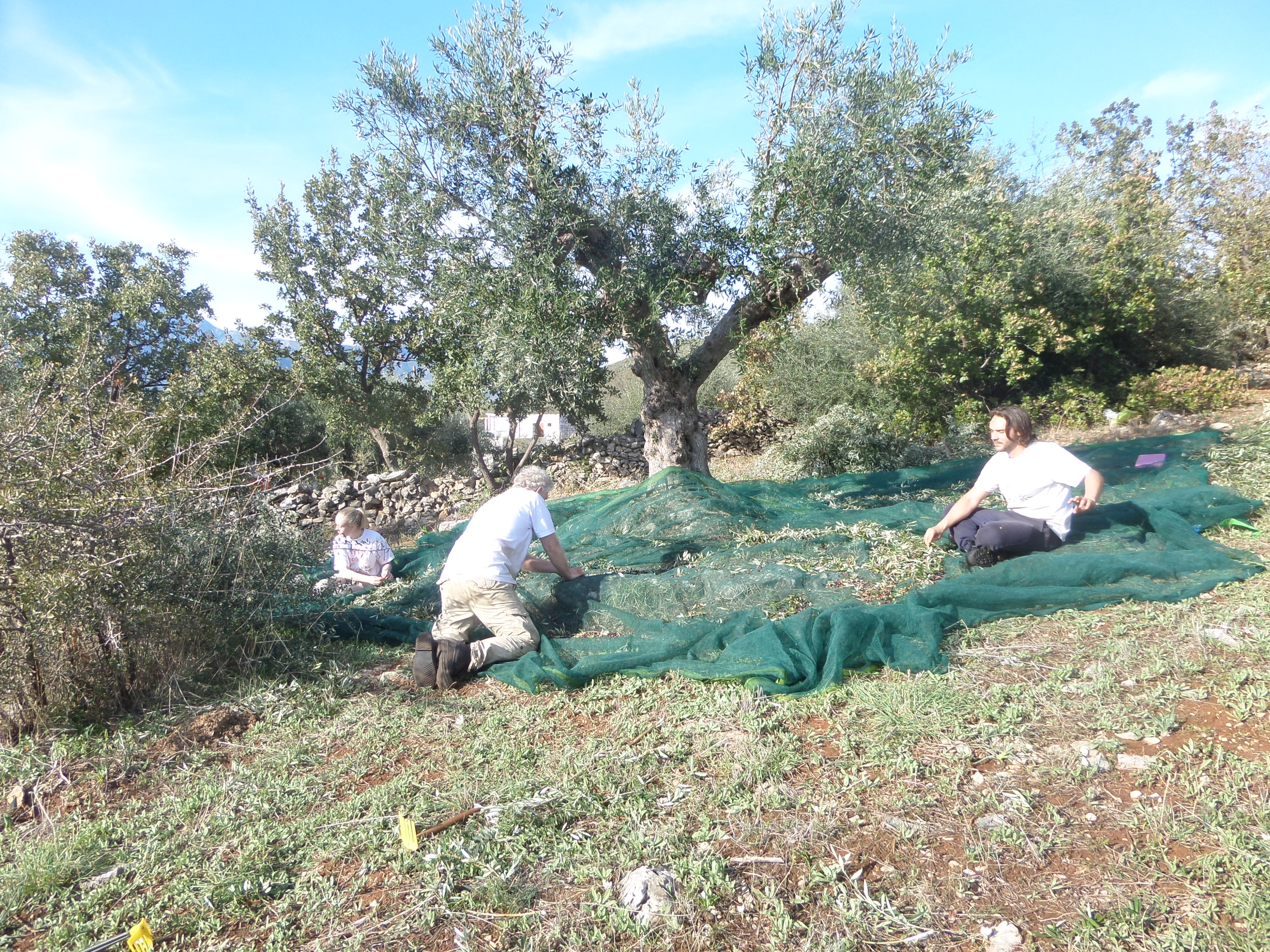 We zijn begonnen in de olijfgaard van een oudere dame uit Marathea, Tasoula, die ons heeft gezegd dat we dit jaar haar olijven mogen hebben. Er zat daar niet genoeg aan om ze te laten plukken tegen betaling. Voor ons genoeg, want toch nog 26 kilo olie (3,5 zak olijven). Dit is inclusief onze eigen drie bomen in de tuin, waar nog 20 kilo olijven ( = ongeveer 3 kilo olie) vanaf kwam dit jaar.