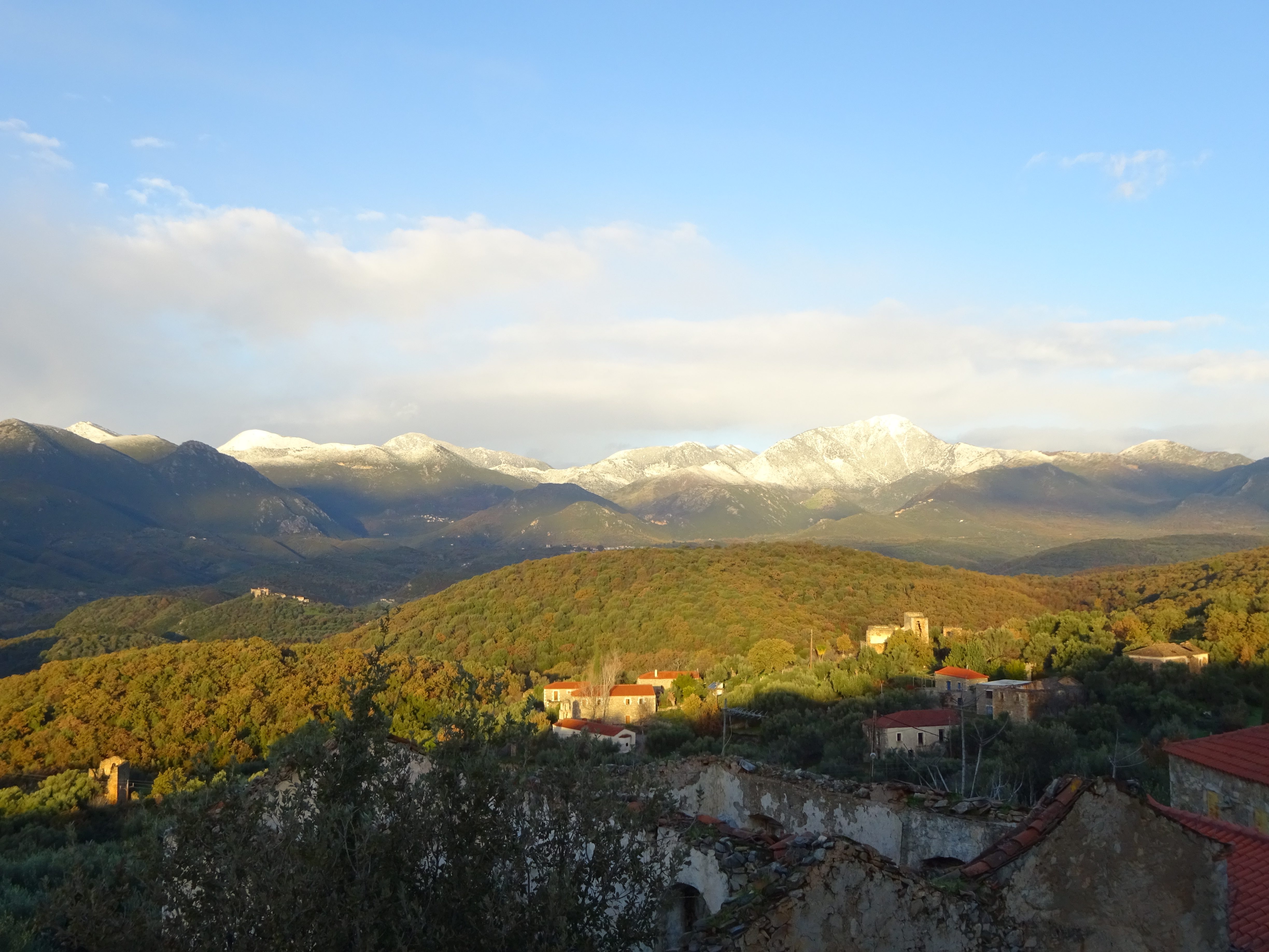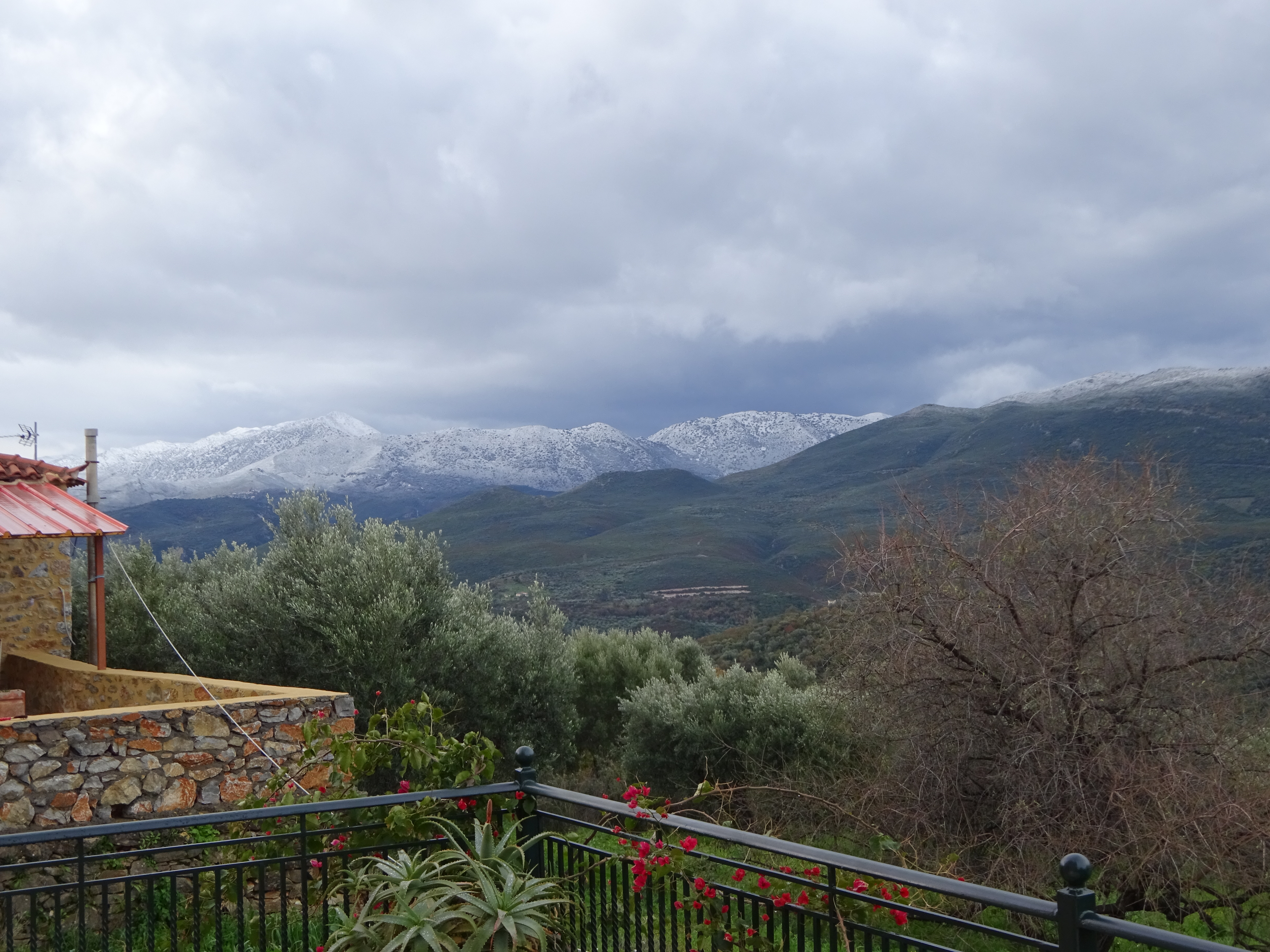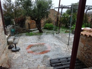 tegenover ons, de “Pyramide” (Profitias Ilias) is helemaal wit en ook het Parnonas gebergte heeft veel witte toppen. Het water bij de honden bij de pers is ’s ochtends bevroren. Echt koud dus. In het noorden van Griekenland is zelfs min 20 graden gemeten. In Attika, de provincie van Athene, zijn dinsdag 8 januari de scholen gesloten geweest vanwege enige sneeuwval. Tegenwoordig krijgt ieder weerfenomeen in Griekenland een eigen naam, deze koudeperiode is Telemachus (in de Griekse mythologie was hij de zoon van Odysseus en Penelope) genoemd. Na de koudeperiode kregen we meteen een regenfront met harde wind (6 à 8 Bft) en geregeld onweer over ons heen. Ook deze periode kreeg een naam, Hypathia (een oud Griekse wiskundige, sterrenkundige en filosofe). De rivieren in de buurt kolken en doen de zee bij de monding bruin kleuren. De plassen op het “varkenspad” zijn zo groot dat je daar niet kon lopen. Het vele slechte weer zorgt ook geregeld voor stroomstoringen, soms van enkele uren. Daar wen je min of meer aan. Op 12 januari kwam er ook nog een enorme hagelbui overeen, de straten waren helemaal wit.